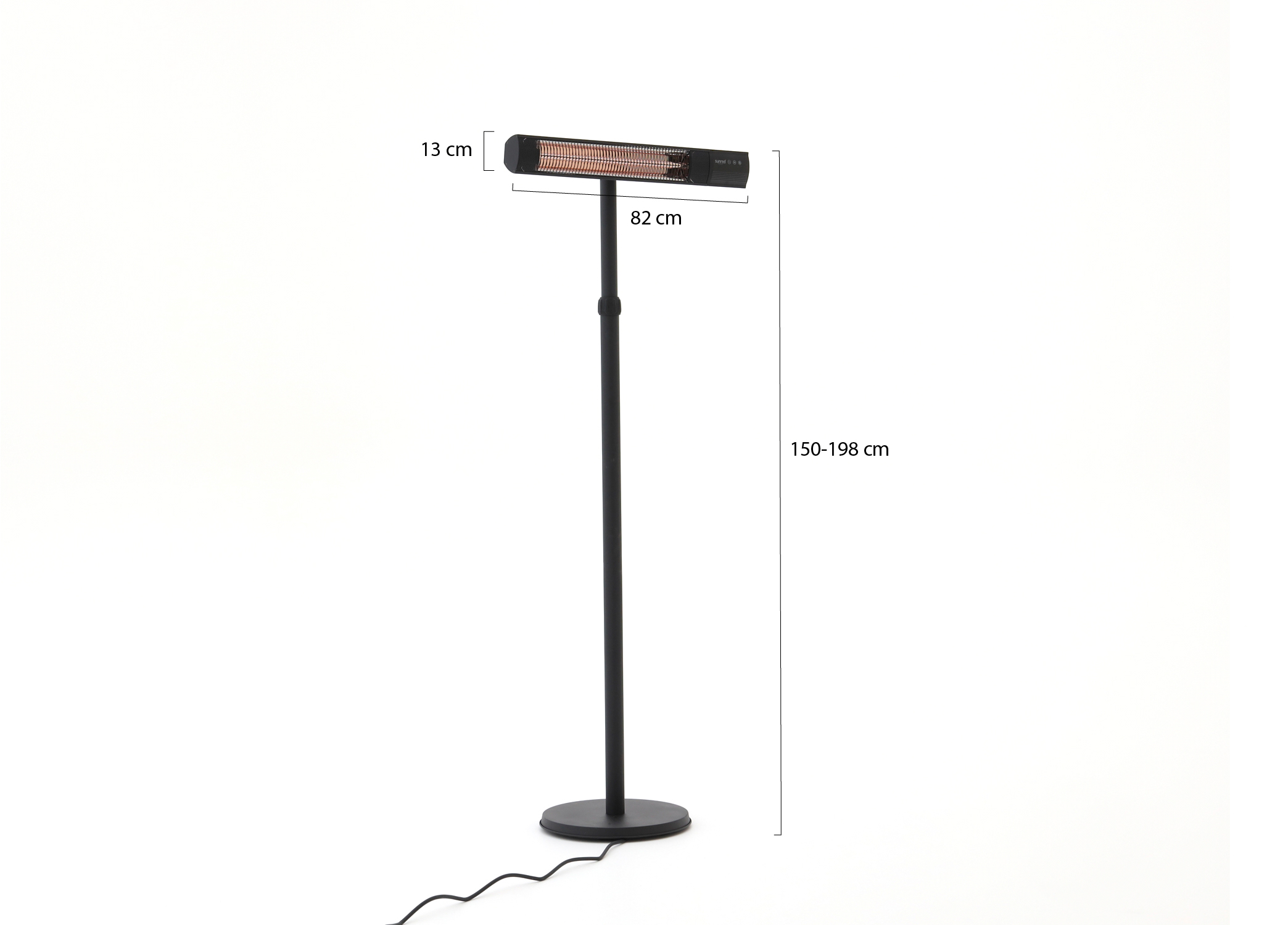 De heater is in hoogte verstelbaar en de kap is kantelbaar, zodat je de warmte precies richt waar je die nodig hebt. Stel de hoogte ongeveer op zithoogte in en kantel de kap licht omlaag richting je zithoek voor een gelijkmatige warmte. Laat rondom voldoende vrije ruimte, richt hem niet van heel dichtbij op glas of doek en verplaats hem pas als hij is afgekoeld. Bedien hem eenvoudig met de afstandsbediening vanaf je stoel of gebruik de schakelaar op het apparaat. De 1,8 meter kabel geeft je genoeg ruimte om hem makkelijk aan te sluiten, gebruik indien nodig een geaarde verlengkabel die geschikt is voor buiten en rol een kabelhaspel altijd volledig uit. Zo pas je de warmte moeiteloos aan elke situatie aan.
